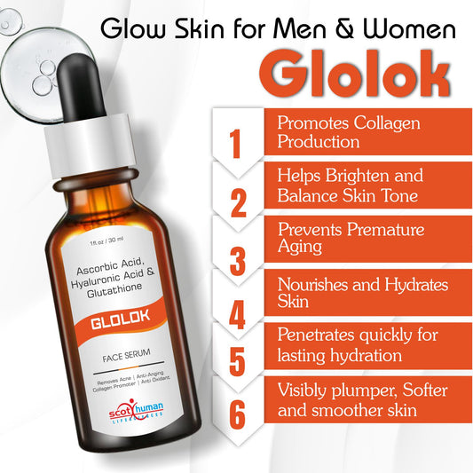 Glolok Face Serum With Ascorbic Acid, Hyaluronic Acid & Glutathione Remove Acne, Anti Aging, Collagen Promoter & Anti Oxidant - 30 Ml